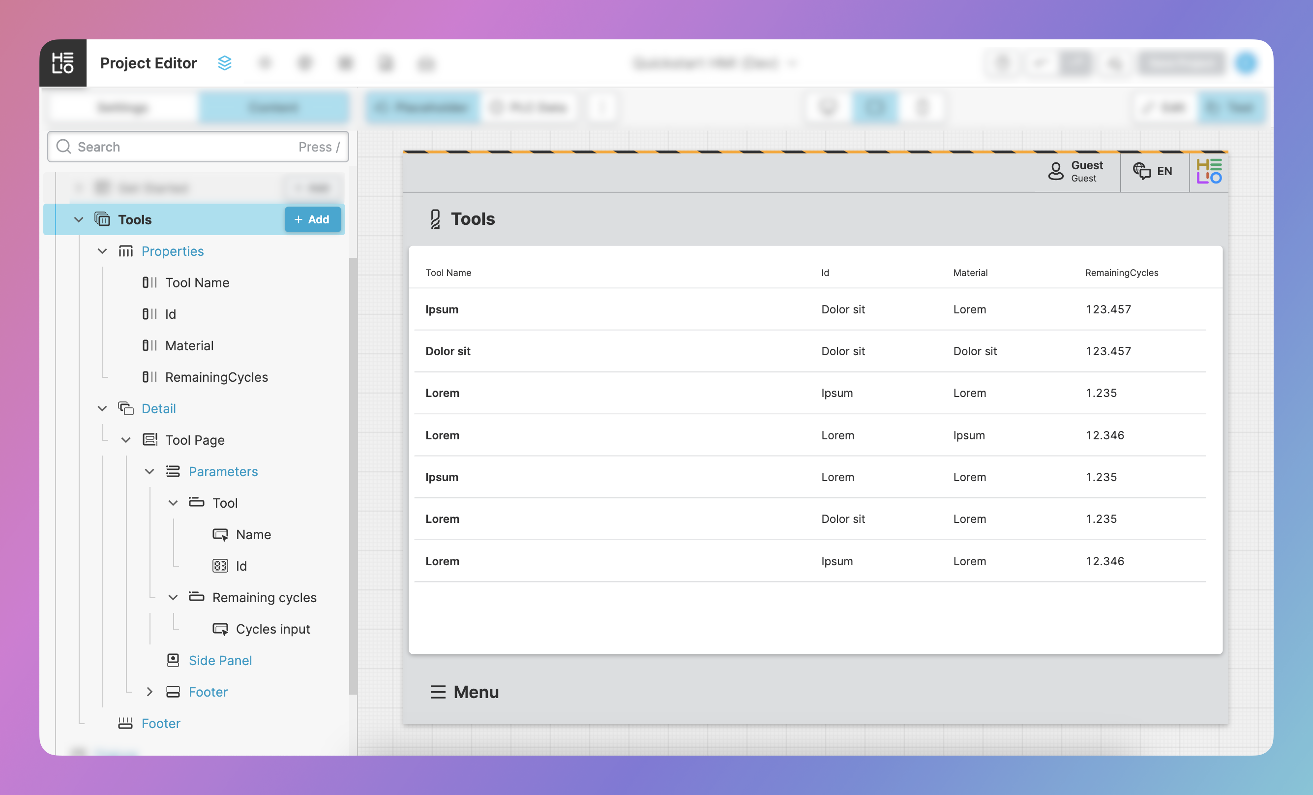 HELIO uses this meta data to create four columns in our "Tools" table and sets the titles according to the names of the blueprint's properties. You can edit this table any way you like, we'll get to that in a second.