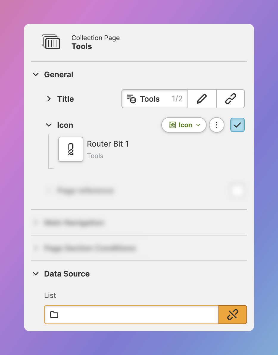 The pages has an icon by default which already works. But let's be a little more specific and use an icon of a tool instead, for example the the "Router Bit 1" icon. This way, our operators will later be able to identify the tools page at the first glance!