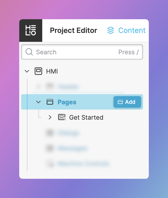 Now that you have created your first HELIO project, you should have your project opened in the Project Editor. In this part of our guide, we will start adding content to our HMI. Specifically, we will cover two of the most important content types: Pages and Elements.