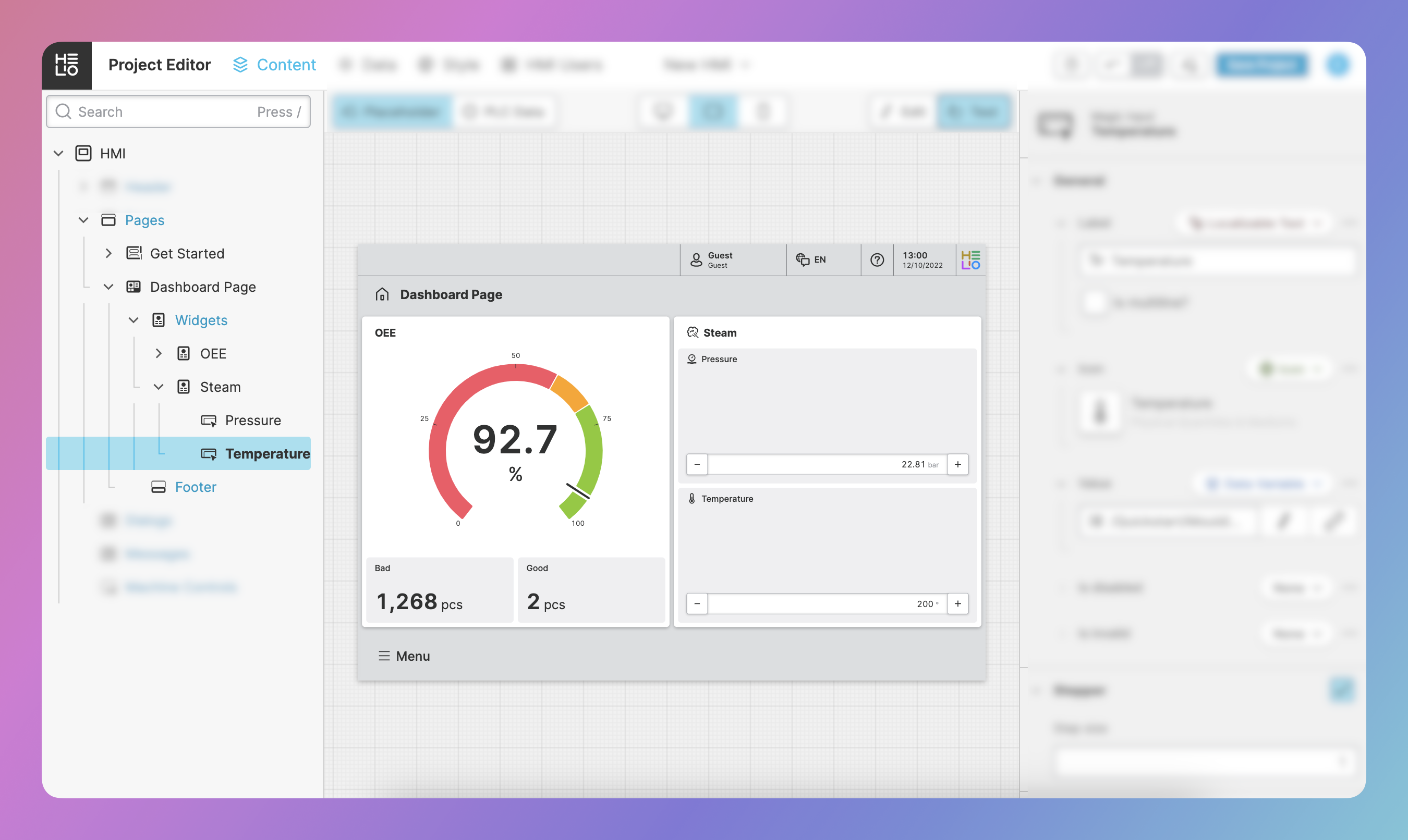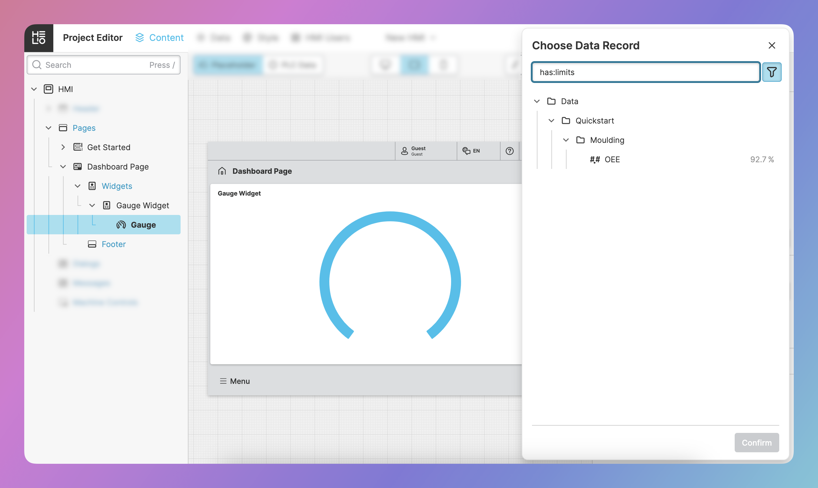 We would like to display the OEE in the form of a gauge and some additional numbers related to our production quality. Let's start with the gauge, since it will be the eye-catcher of our dashboard.