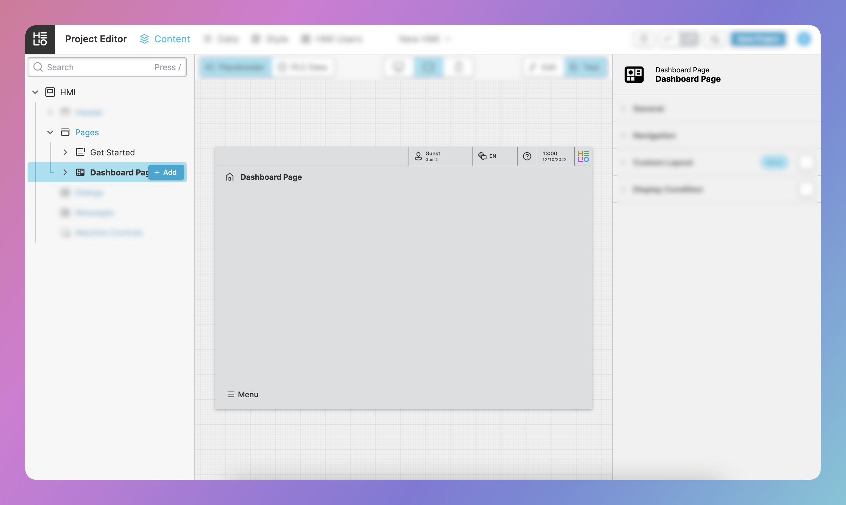 Let's dive in and create a first page! In HELIO, every page is special and serves a unique purpose. To kick things off, we'll make a Dashboard Page, which is a helpful page type often used as a welcome page to your HMI.