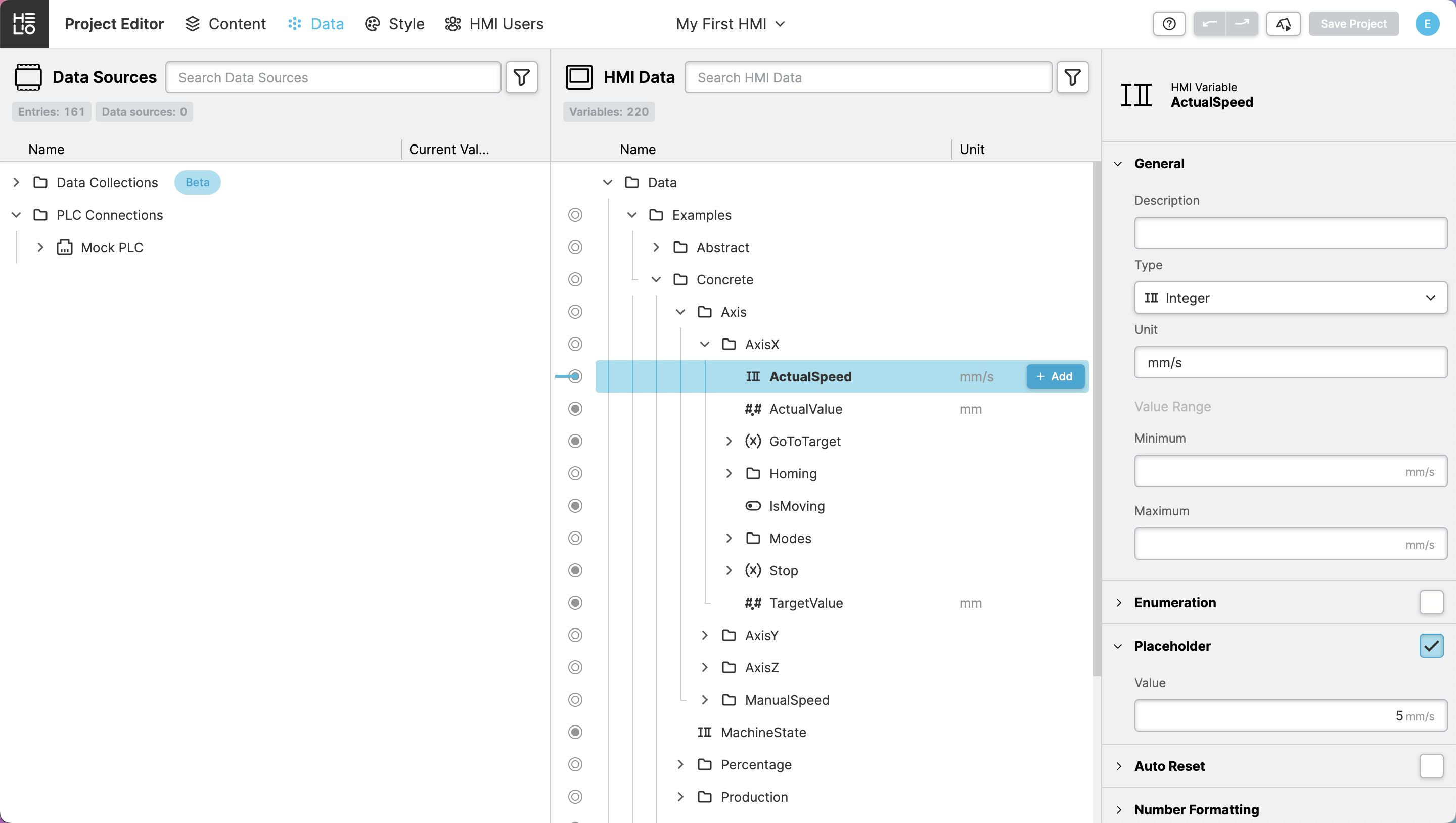 This is the area where you manage all of the data that makes your HMI dynamic. You can connect to different data sources, such as your PLC, as well as structured JSON files on the target device. There are many different ways to set up your data structure, create and edit variables, and use them in your HMI.