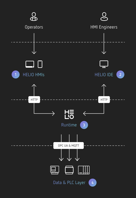 The Data & PLC Layer provides the 'Source of Truth' for your HMIs. HELIO is a multi-user and multi-device HMI layer. As a result, all logic and actual data should reside within your data sources such as the PLC on your target device or centralized backend services. HELIO leverages standard interfaces, such as OPC-UA, to access those data sources.