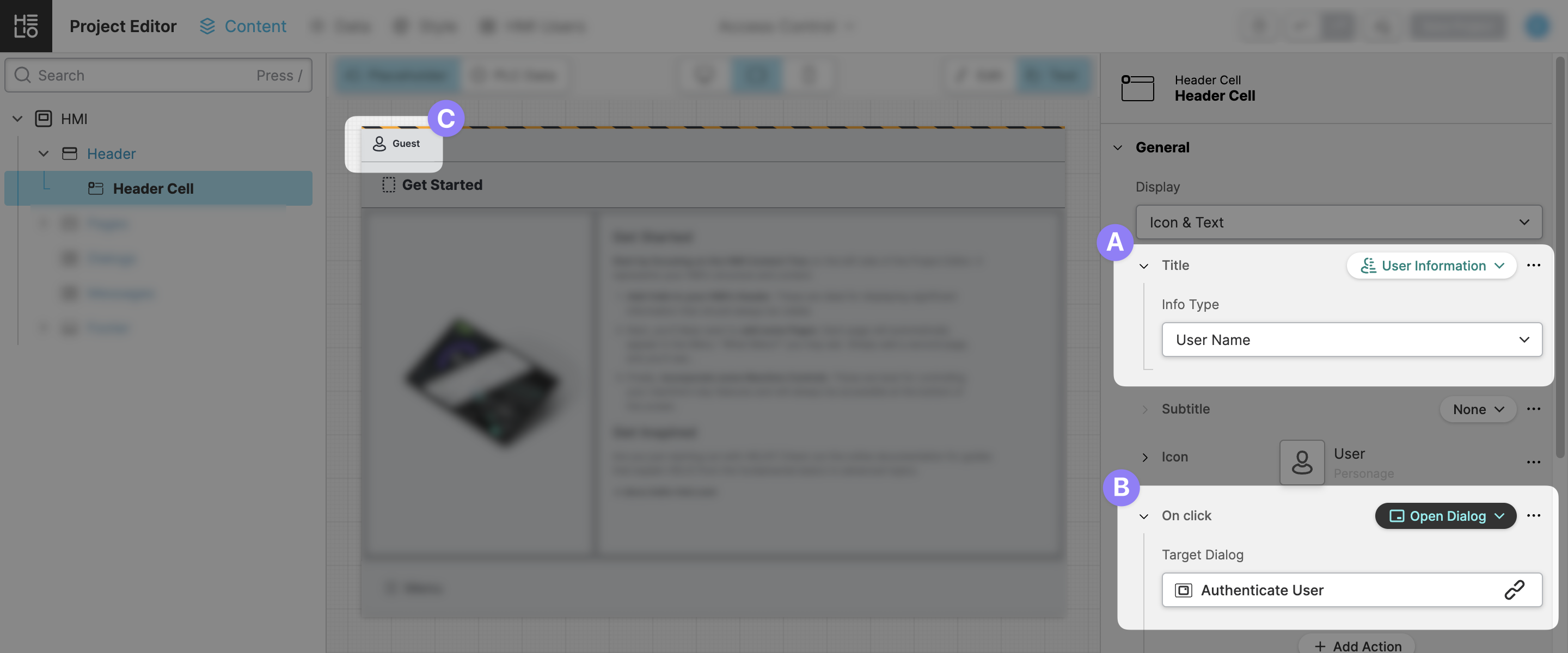 since we haven't signed in yet.Next, we aim to add the sign-in functionality. Using the type chooser of the On click property of the Header Cell, select an appropriate action that will respond to the click event.