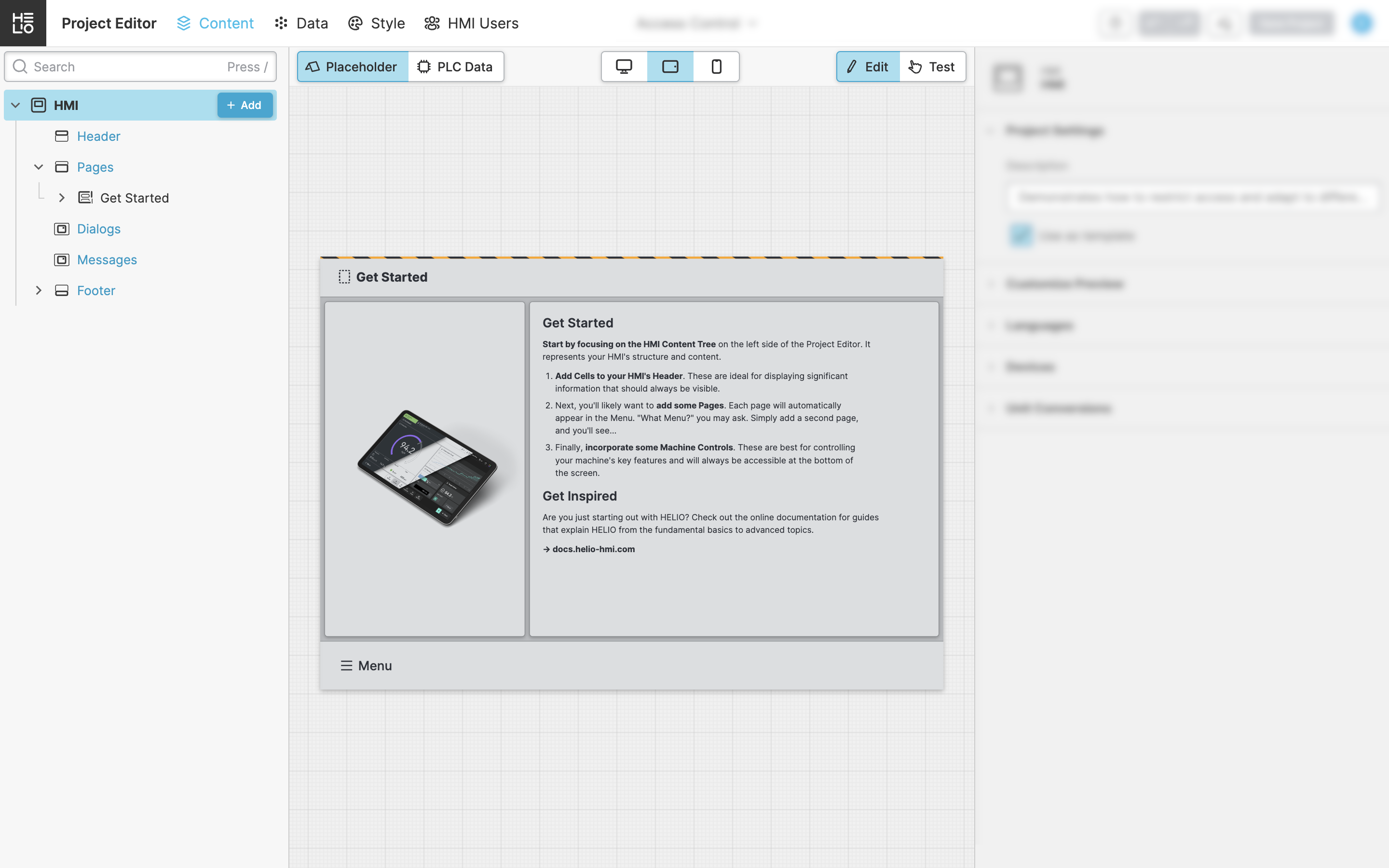 displays the settings used to initialize your HMI. This initialization takes place when your project is first launched on a HELIO Runtime, during which the initial users and roles are created.Once you begin testing your project within the IDE, this initialization also occurs in the