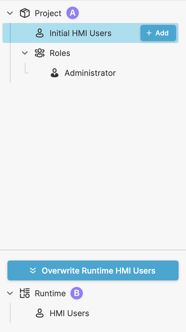 For each project you can create a list of initial HMI users that will be available for a project once it has been deployed and started on target device.