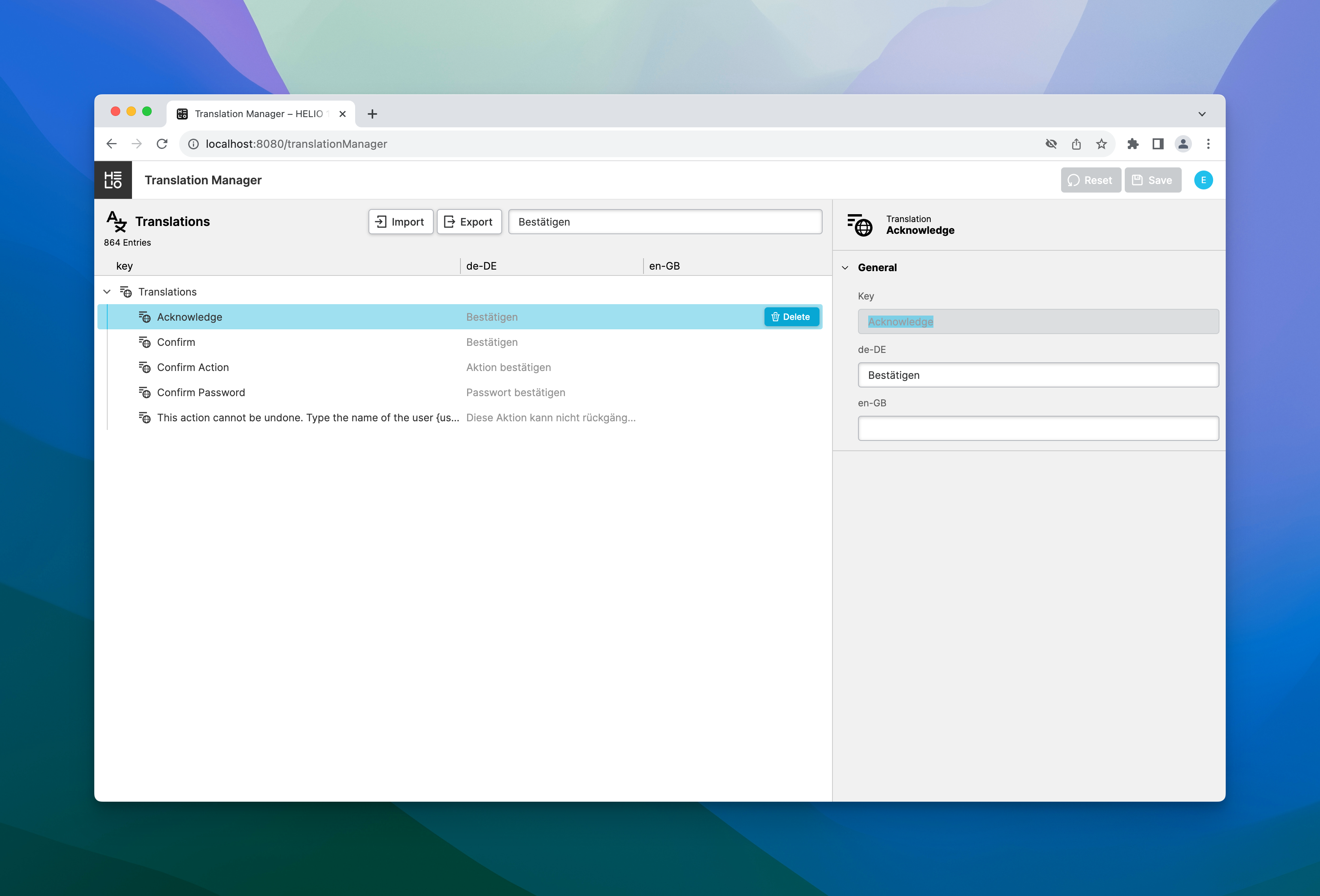 Implicitly | Translations are created while you add new Elements to your HMI. Whenever you edit a property of the type Localizable Text and save your project this text will get stored in the Translation Database of HELIO. | Throughout the project |