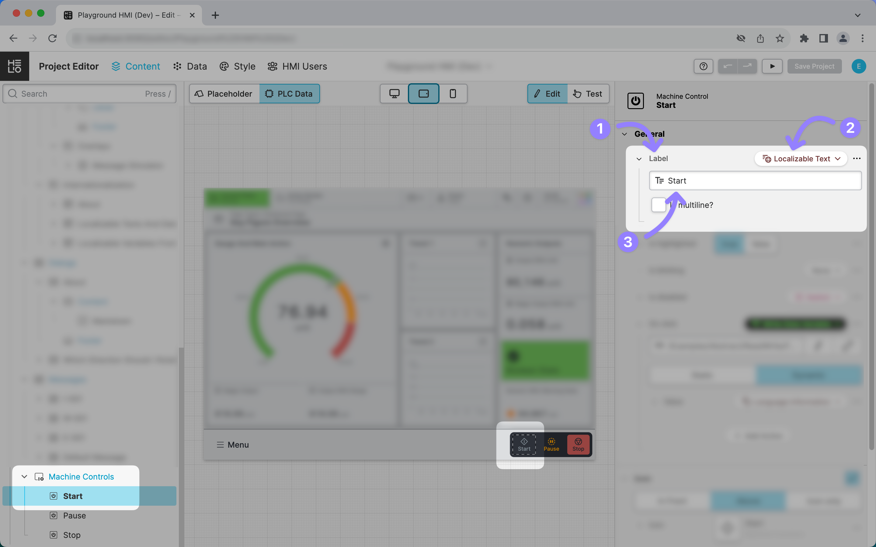 , which, in this case, is the translation in the default language, English. However, you could also opt to use a unique key that more stable, won’t change over time, but still communicates its text's purpose .e.g.MainFunctions.Start.Label