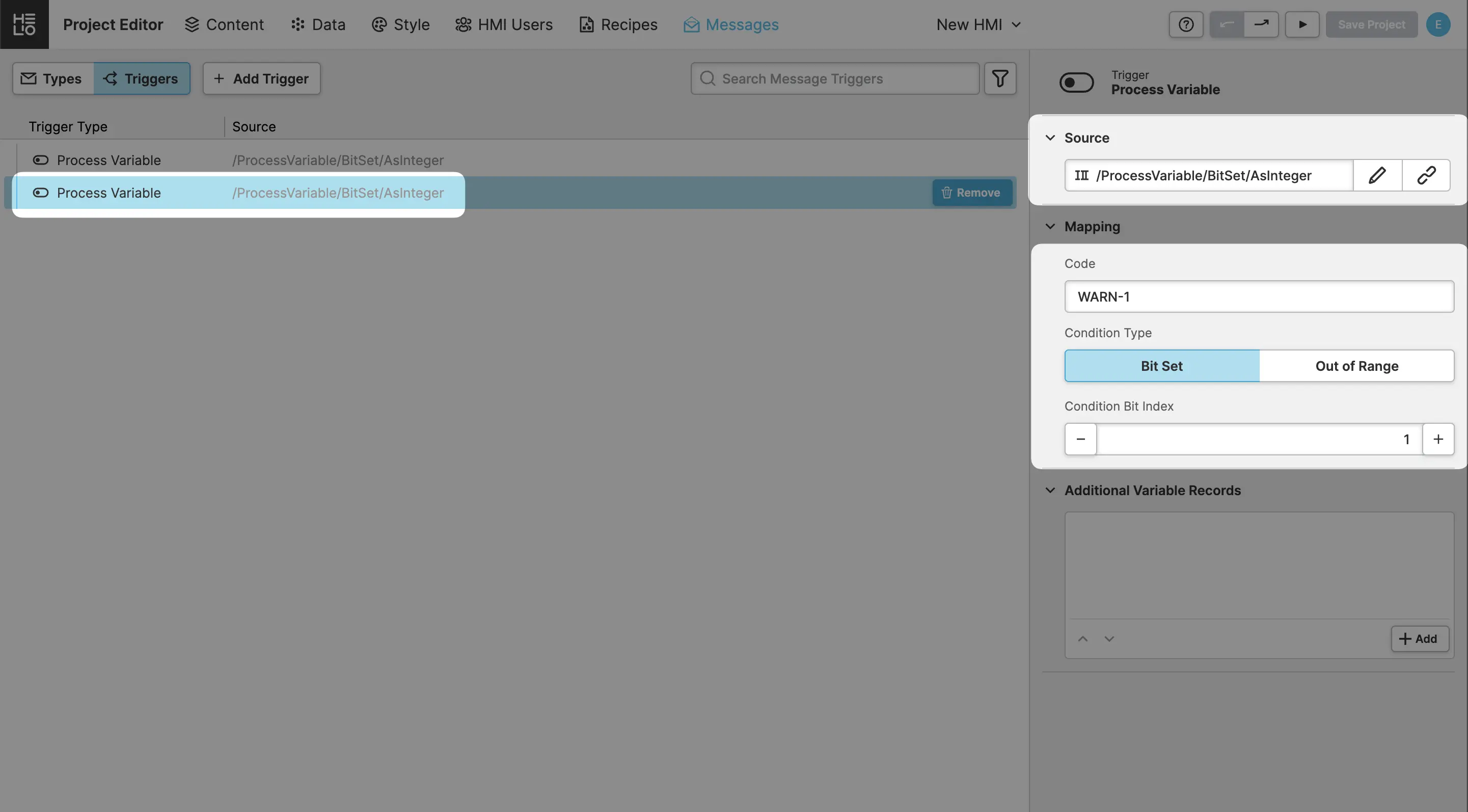But often you just want to use a simple boolean logic to trigger messages. For example you might want to show a certain message when the PLC sets a certain switch and hide the messages as soon as the PLC resets the switch.Toggling messages like this is a piece of cake when using the bits of a variable.