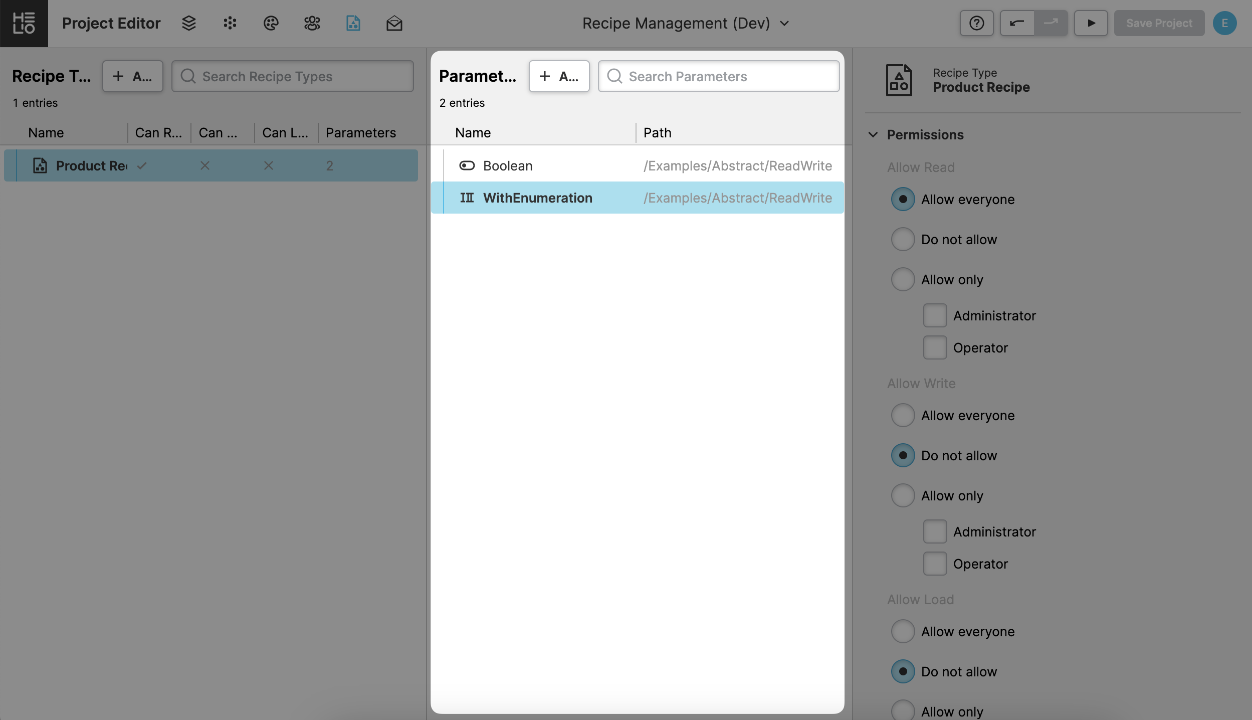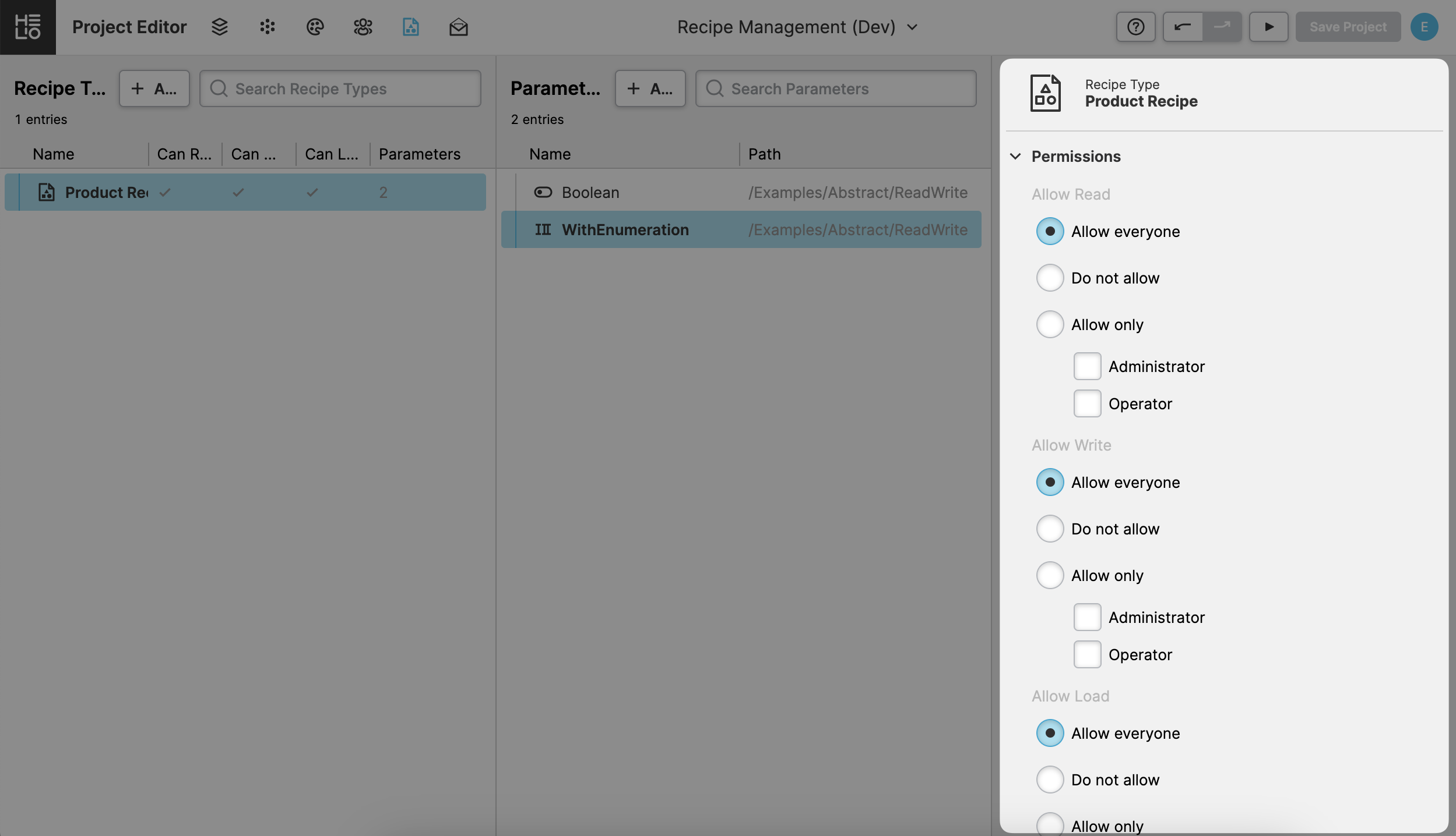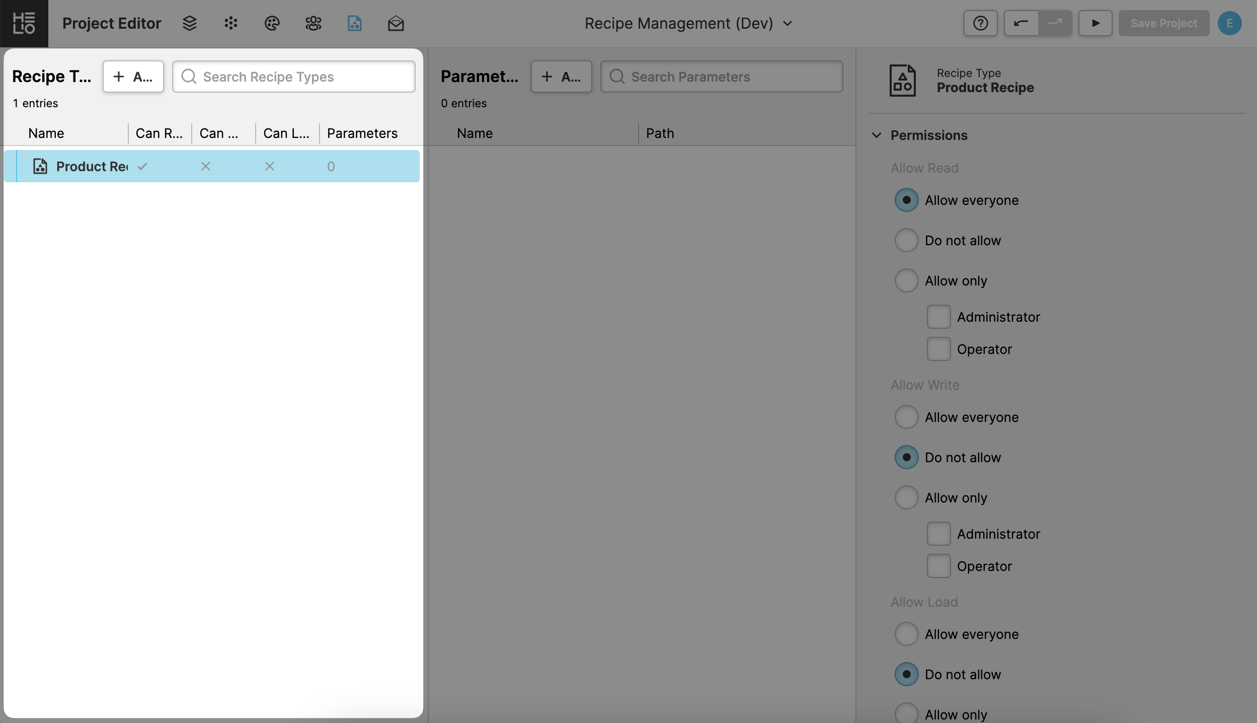 Create a Parameter Page with all the values of our recipe type and a Save as Recipe Action button so that you can actually create different recipes with different settings quickly.