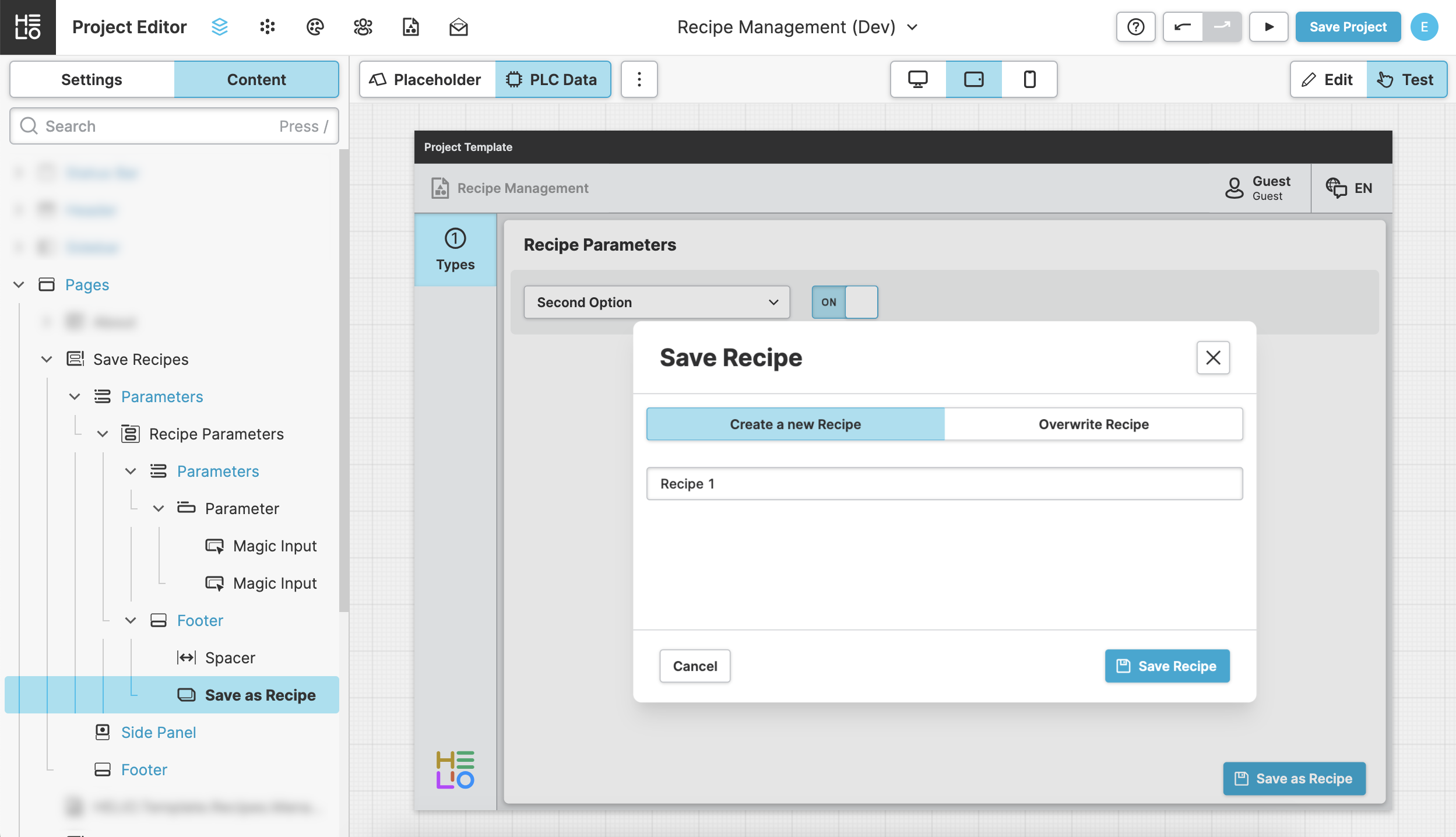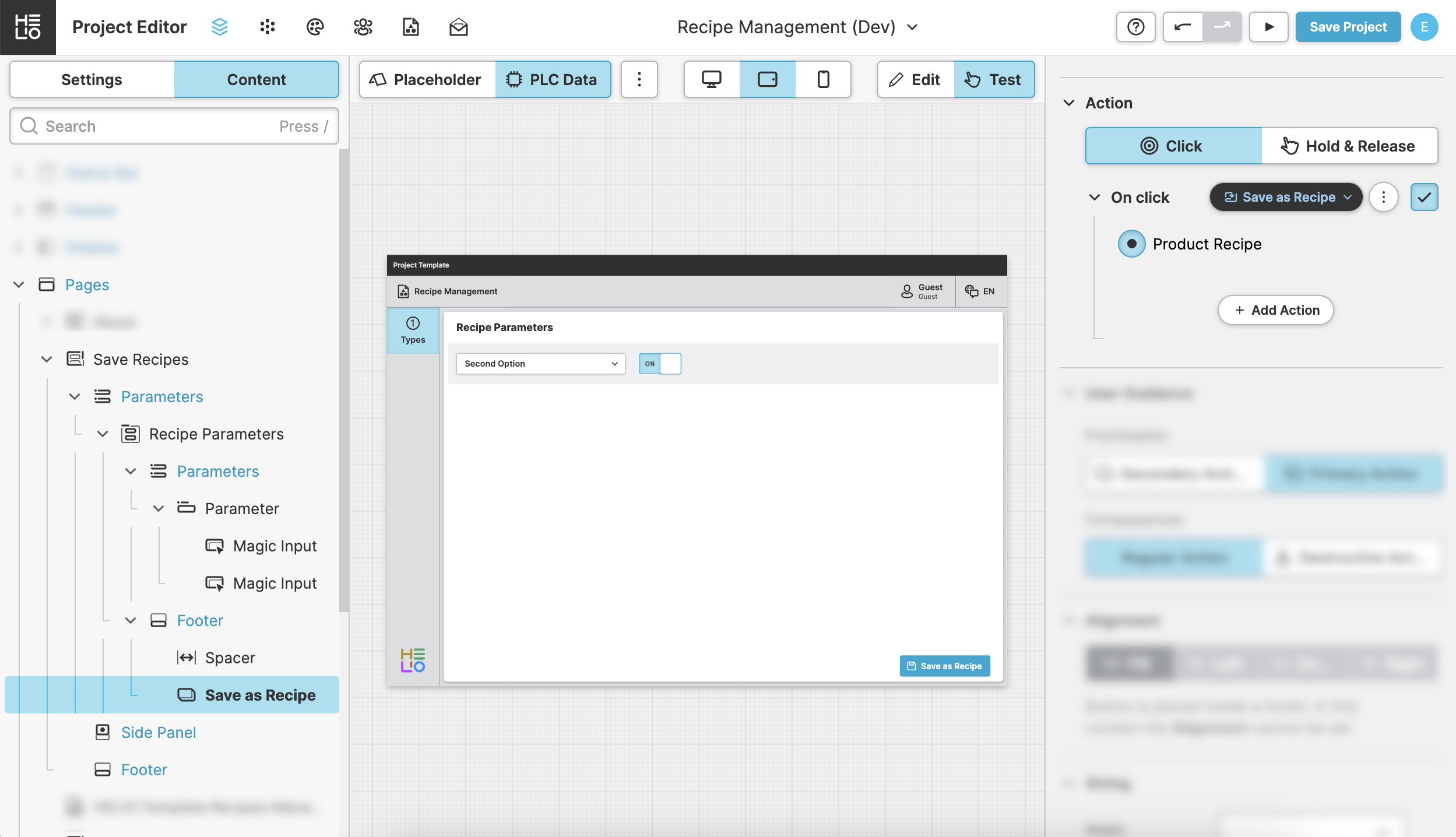 In a real world scenario, the parameters of a recipe type might actually be scattered all over your HMI and you may want to add a Save as Recipe Action button to your header or footer.