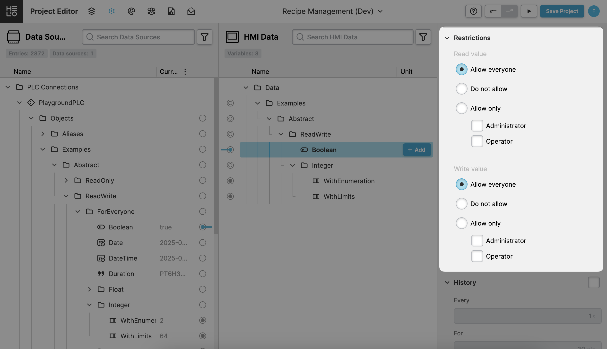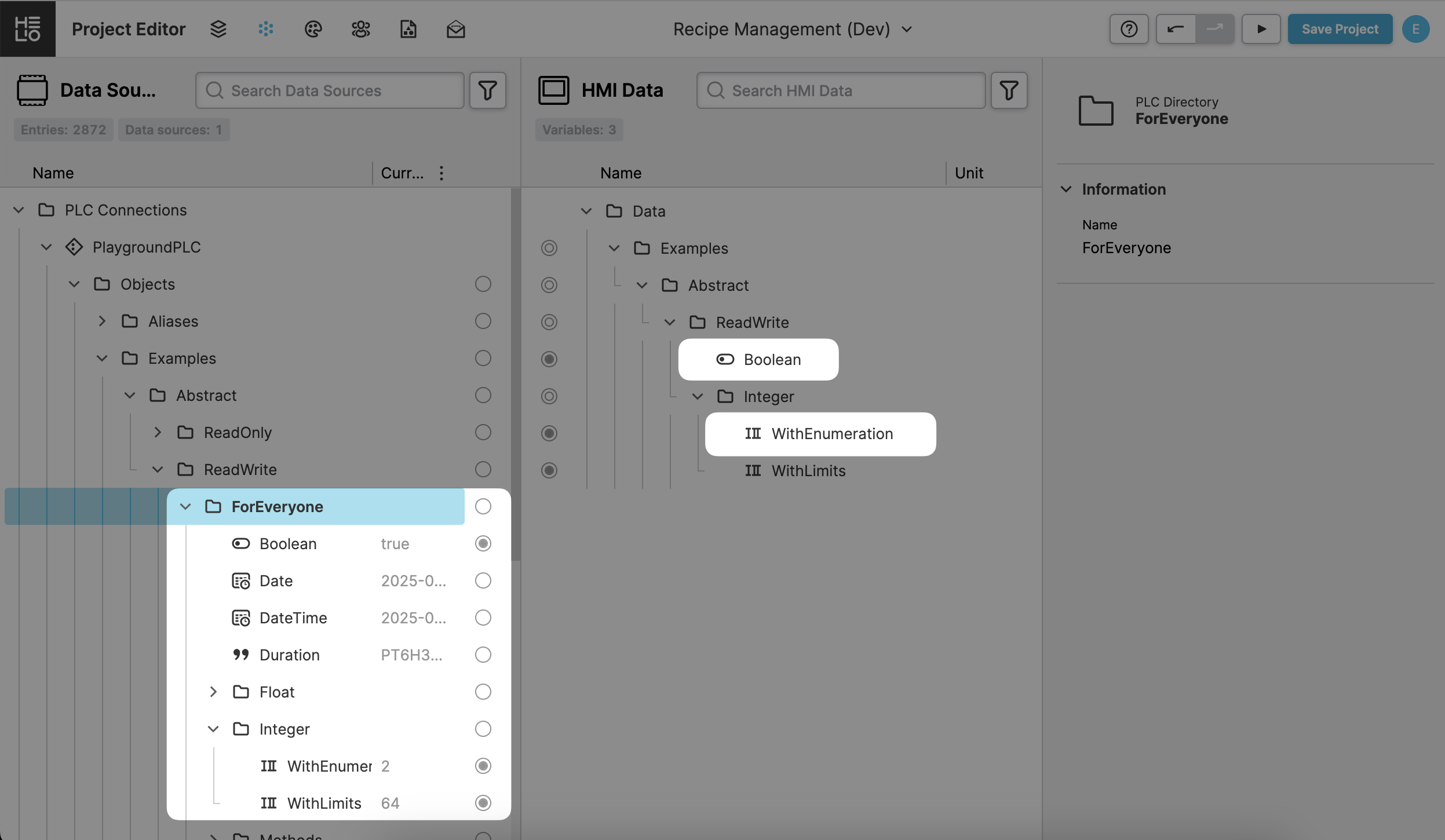 Setting up Recipe Management requires just a few clicks since you can build upon all the data and variables that you've set up for our HMI in the Connect & Control Your PLC section. However, as you're are starting from scratch here, you must first create a PLC connection and import some variables.