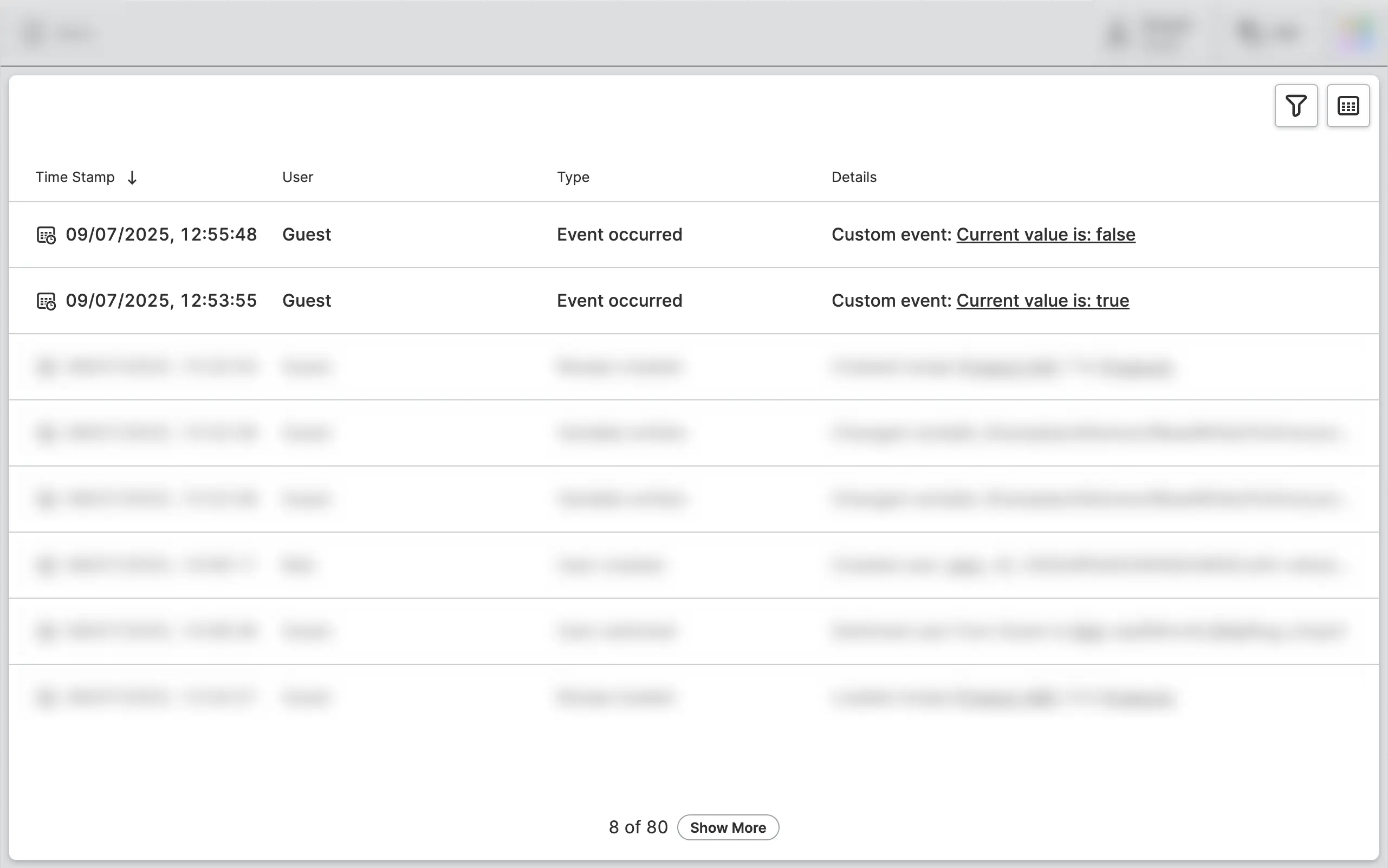 Once we've recorded some events we can now navigate to the Audit Trail Page we've created before. It will now be filled with our additional custom events: