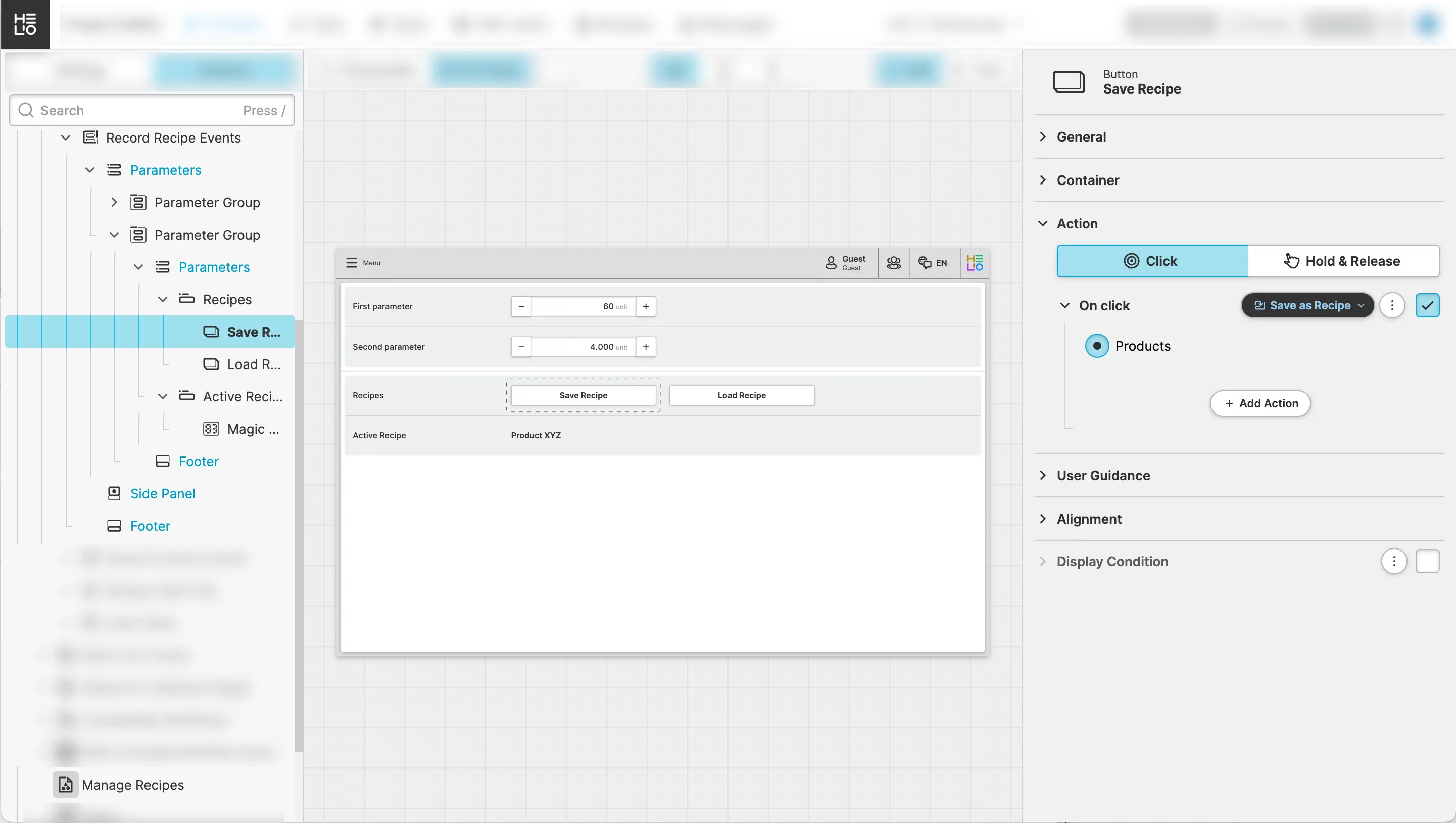 Add buttons to the existing Parameter Page in order to save and load recipes using the Save as Recipe Action and Open Page as Overlay Action actions.