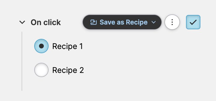 ReferenceActionsData & PLCSave as RecipeOn this pageSave as Recipe Action About Opens the Save Recipe dialog, to enable operators to save or override recipes and set a name for them. Properties Recipe TypeChoose one of the predefined Recipe Types to be saved via the Save Recipe dialog. Related ElementsRecipe Management PageActive Recipe MetadataButton GuidesRecipe Management