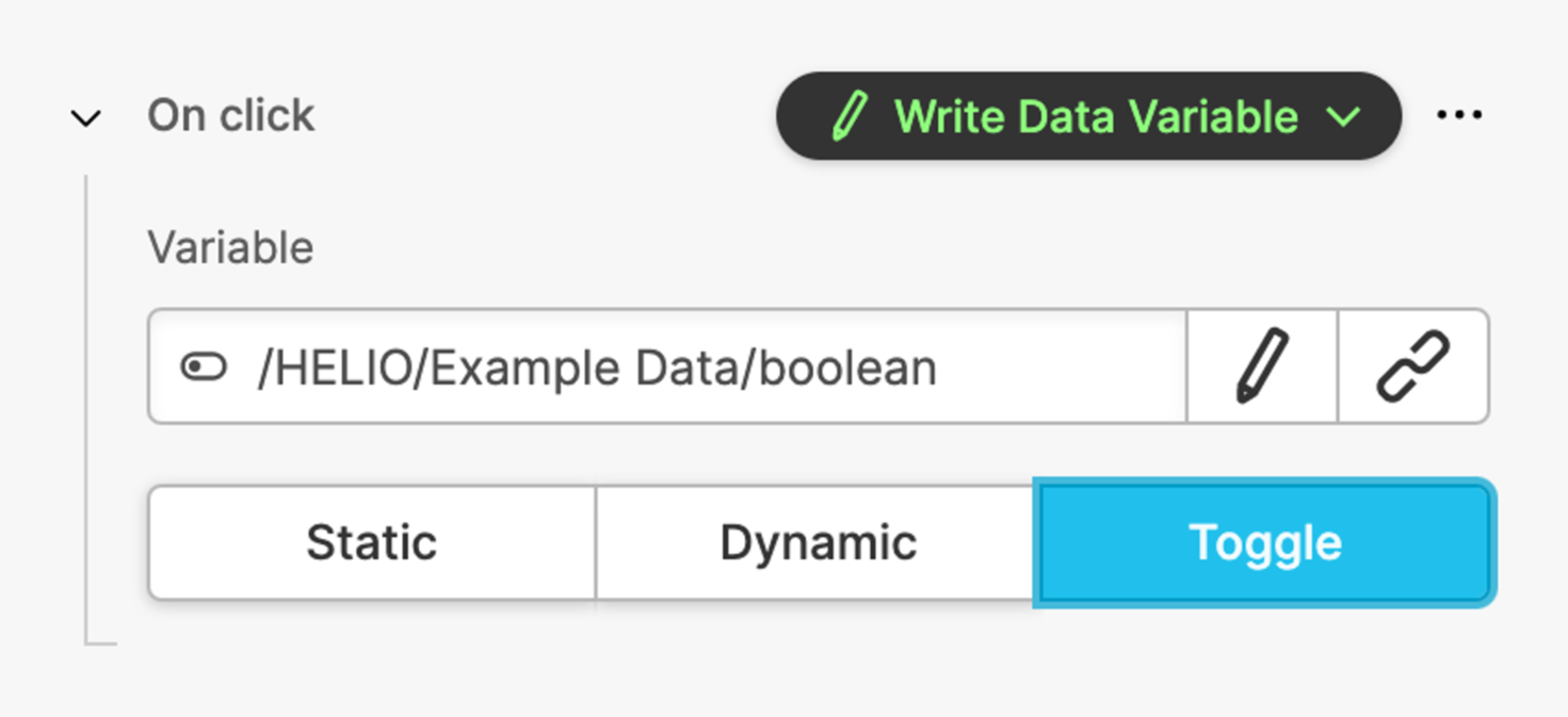 When using variables of type Boolean, you may want to toggle the current value instead of setting it to a fixed value such as true or false. In this case, you can use the third Toggle option to negate the current value.