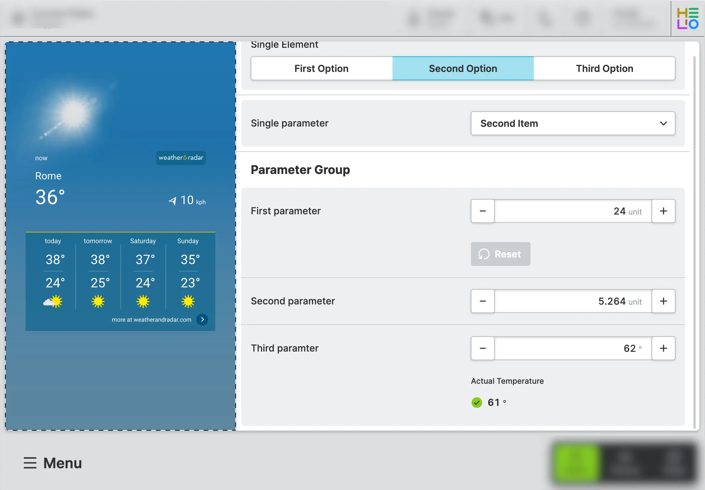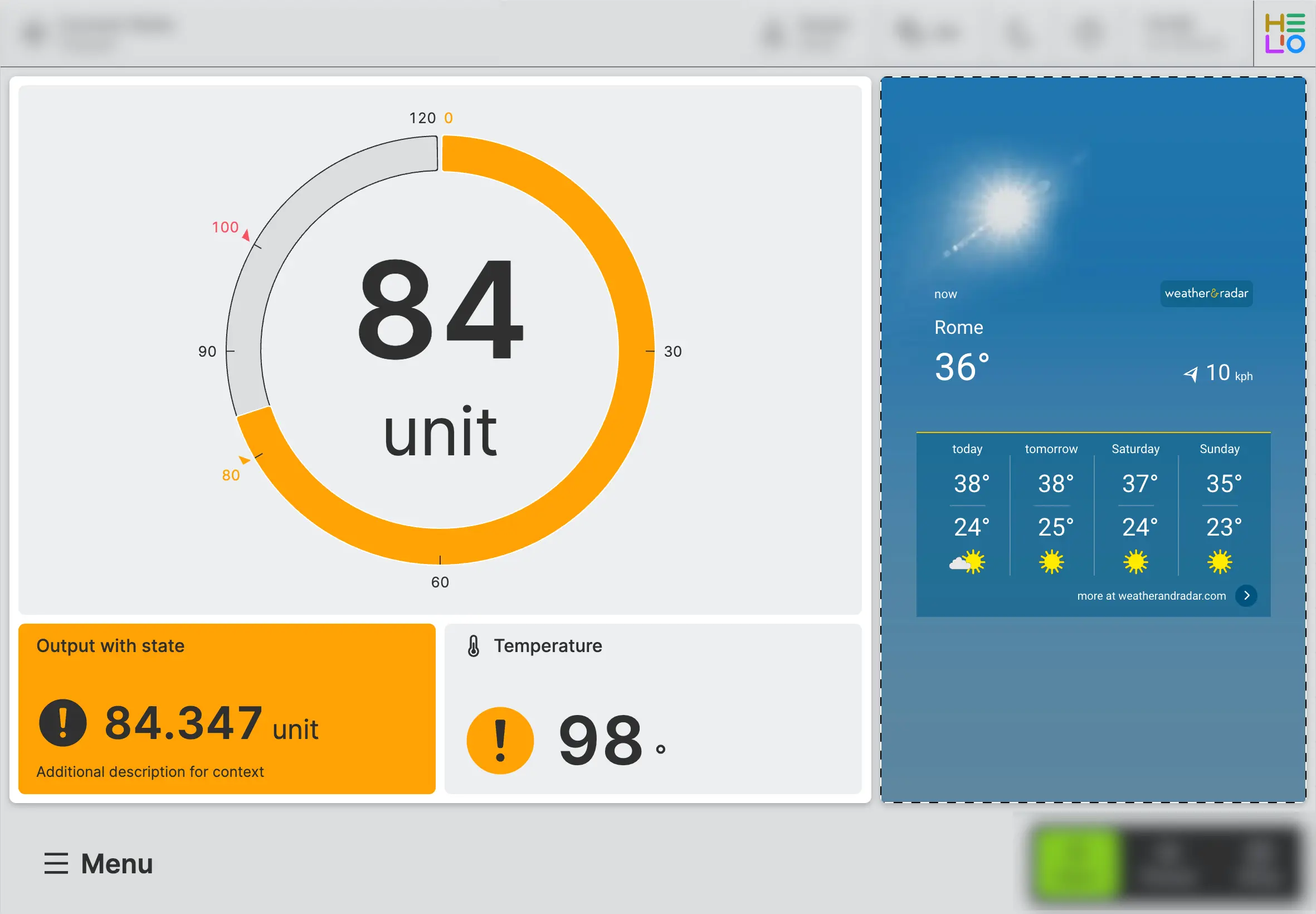 Allows you to integrate third-party web applications into a Dashboard Page or a Parameter Page. Essentially, it renders an iframe to which you can point a URL of another web application running on your target device or somewhere inside your corporate network. The element will adapt its size to its parent container and resize the iFrame element accordingly.