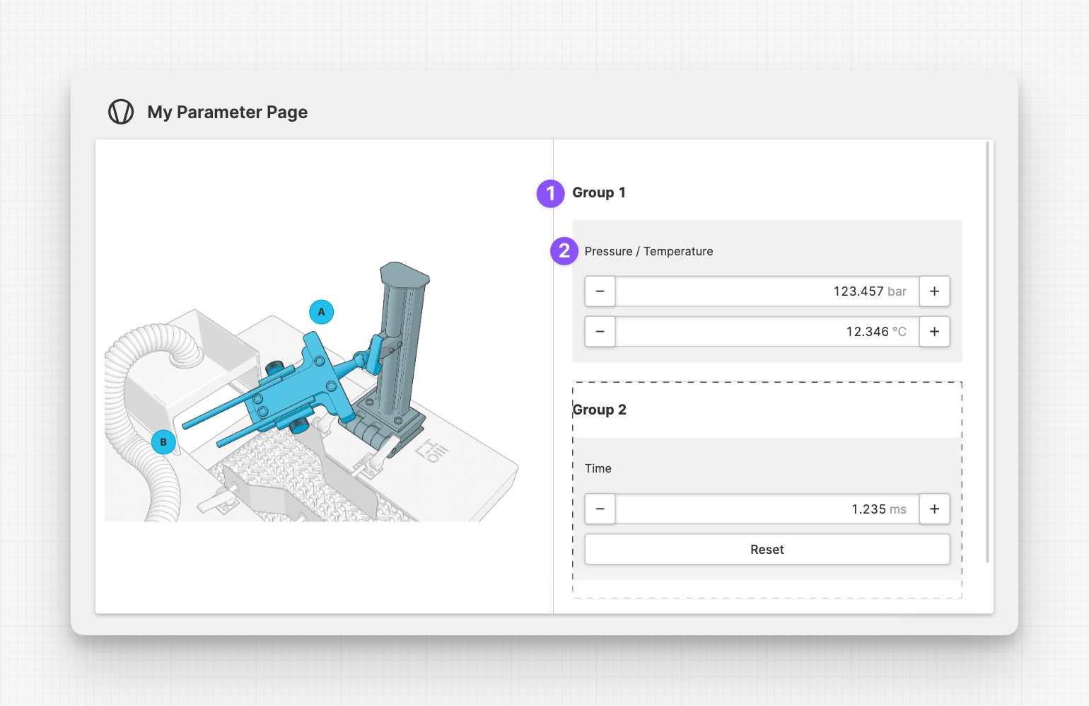 To visually group related parameters, you can use the Parameter Group element. Add it to the Parameters slot of your page.