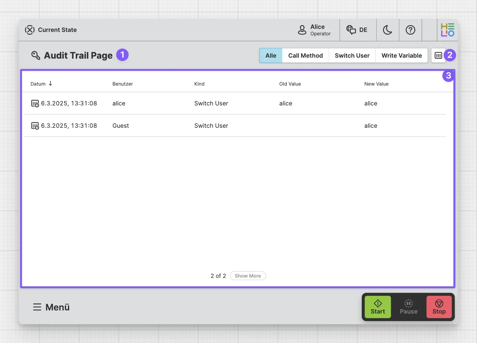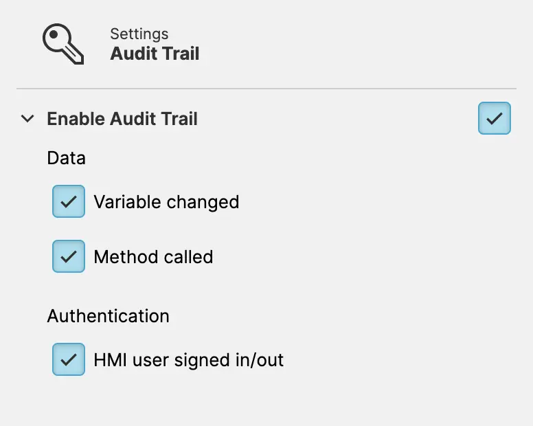 Please note that to enable the audit trail within your HMI, you must activate it through HELIO’s Audit Trail Settings. Additionally, you will need to specify which interactions you want HELIO to track, which can also be configured within the settings.