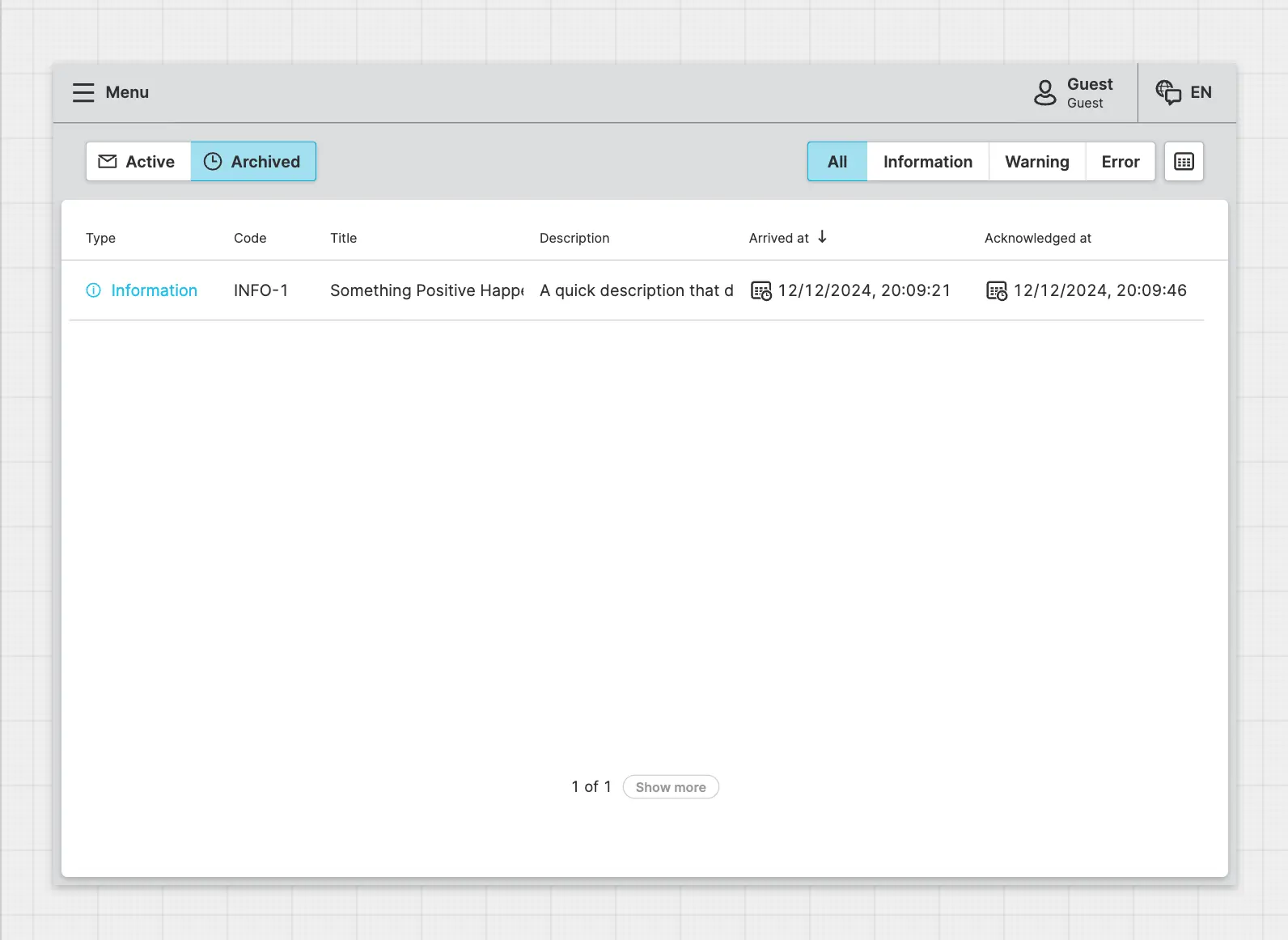 displays the list of active messages as well as the archived messages. - Using the Button Group in the header of the page, operators can easily switch between these two collections.