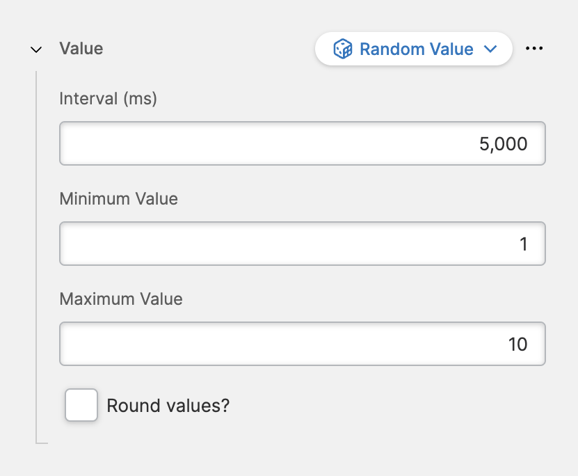 ReferenceDynamic PropertiesData & PLCRandom ValueOn this pageRandom Value About Use this property to generate random numerical values within a specified range. It's primarily used during the prototyping of an HMI. Related ElementsMagic Output