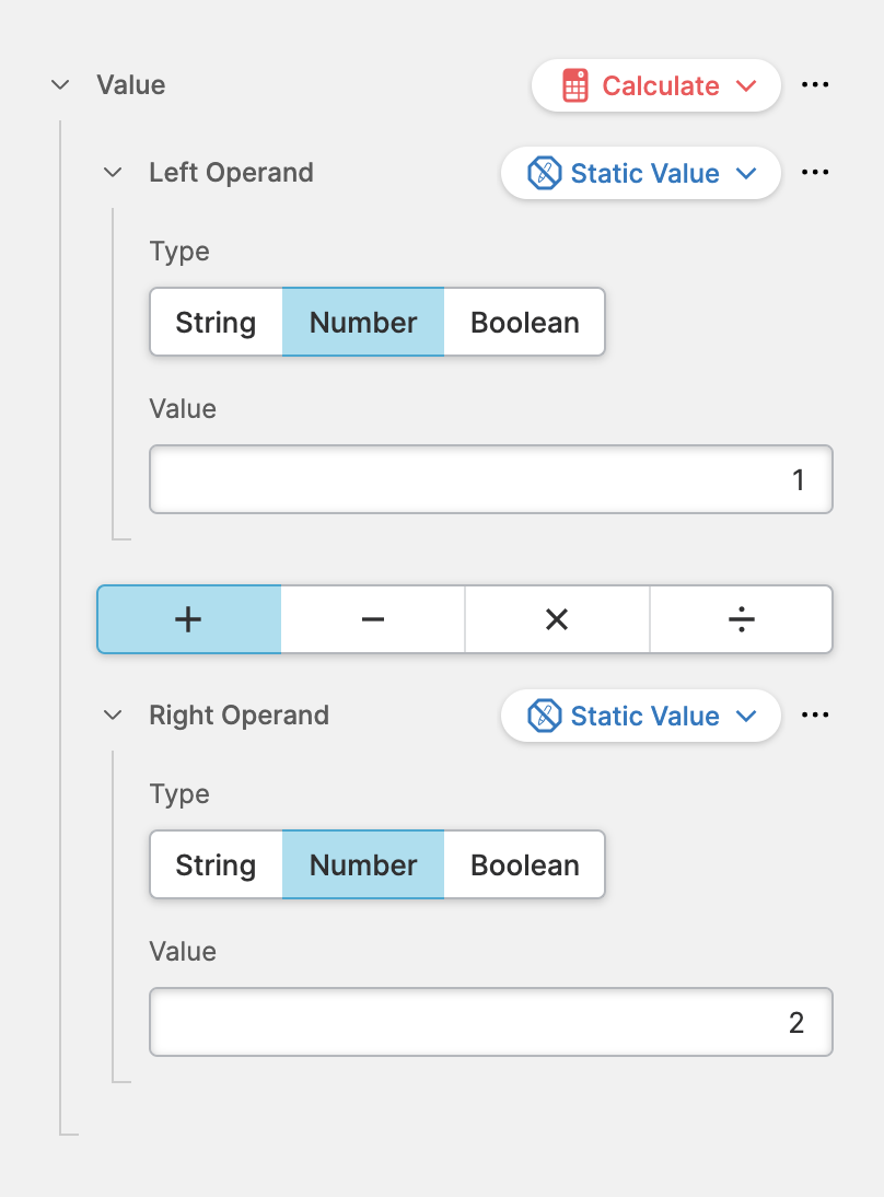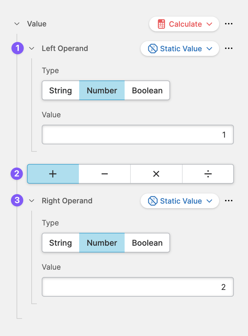 This is the first value within the equation. It is a Dynamic Property, so feel free to compare any type you like. In most of the cases you'll probably use a Data Variable (Dynamic Property) of a numeric value.Calculation Operator