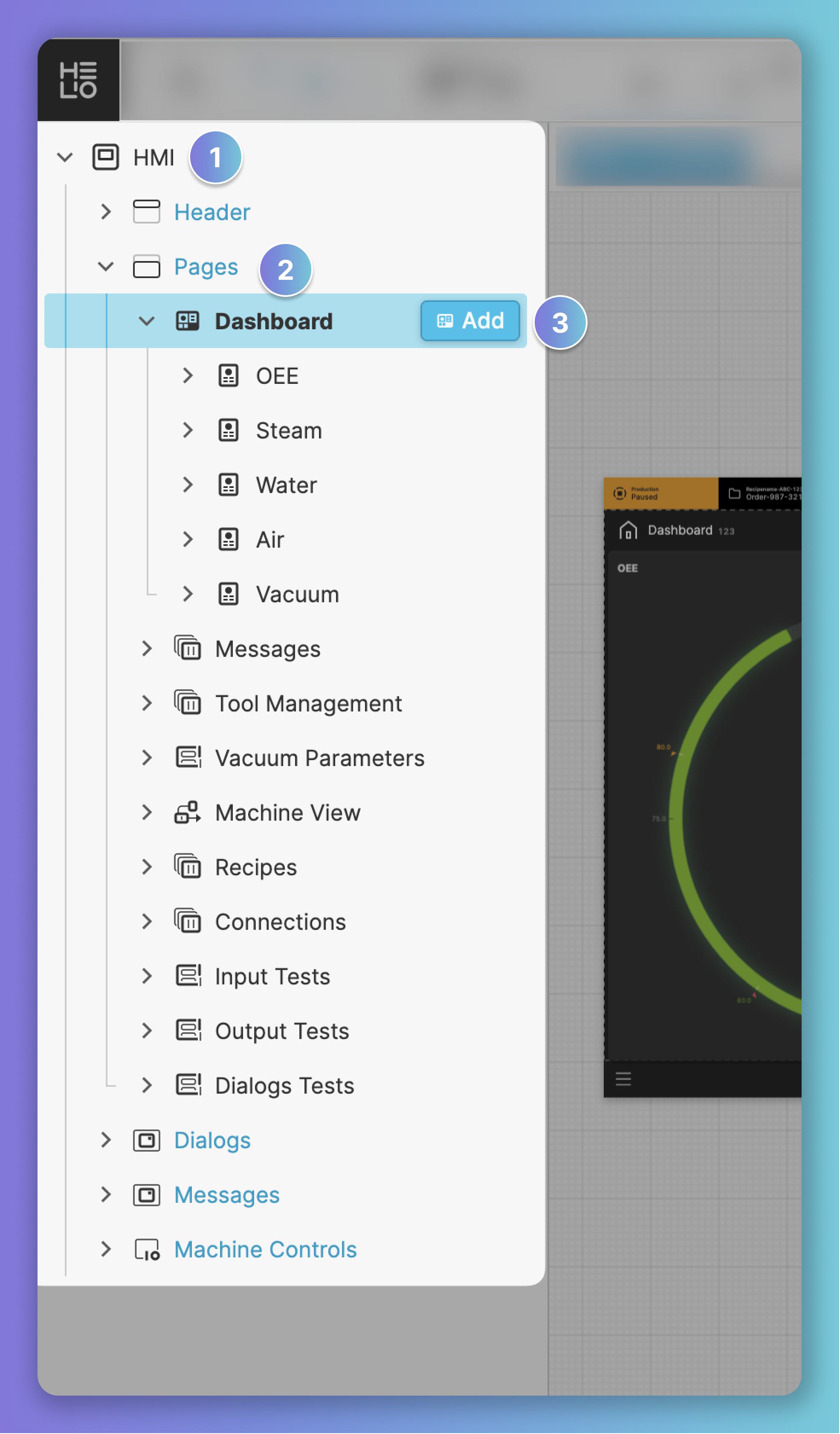 The HMI Content Tree displays the hierarchy of the pages and elements of your HMI. It provides an overview of the structure of the HMI and allows users to easily navigate to different pages and elements without having to use the HMI Preview Panel.