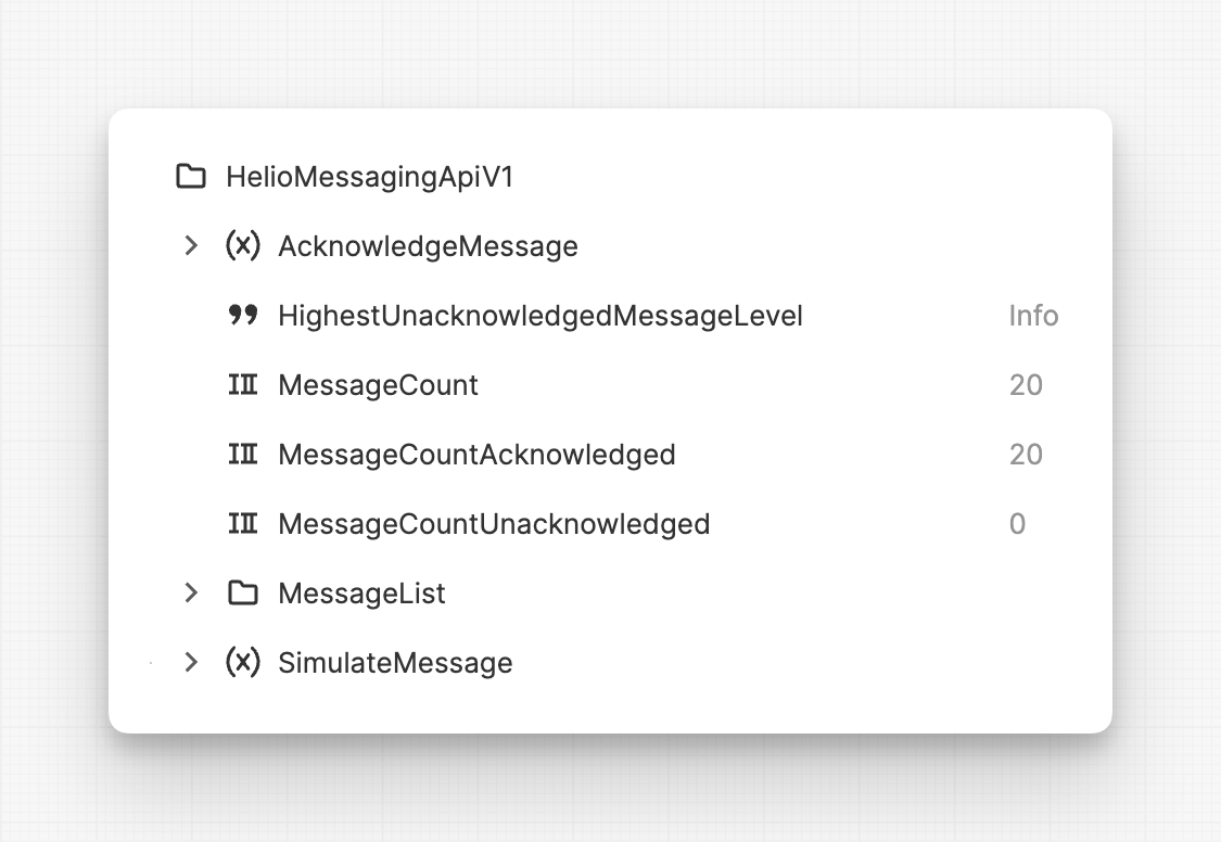 WasAcknowledged | Boolean | false | Has this message been acknowledged? If not, and the ID of the message is unknown, then HELIO will treat this message as incoming and display it, if the project is configured to do so. |