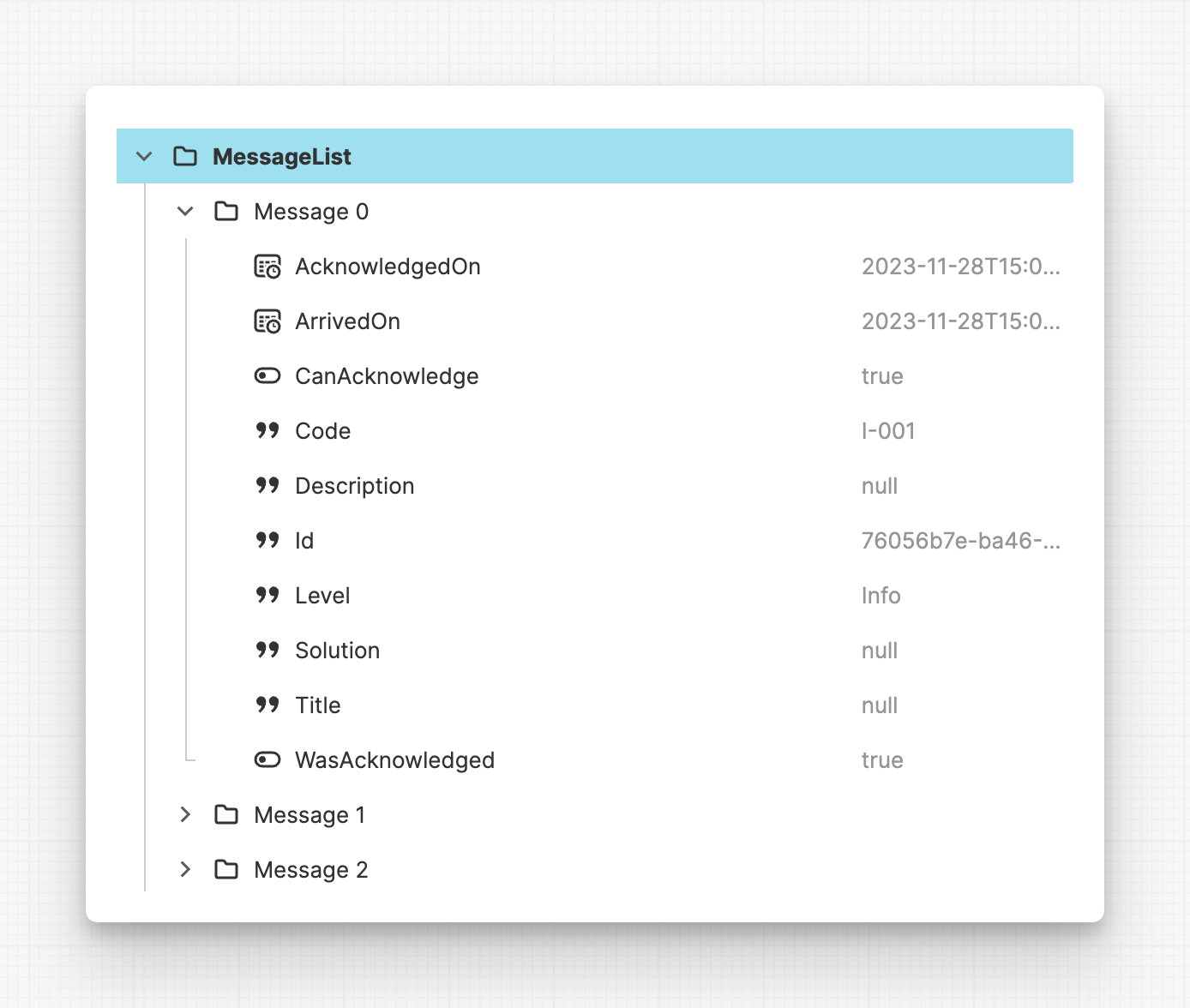 ArrivedOn | DateTime | 2023-08-14T06:41:05.935Z | Date that will be used to sort the messages in the HMI. |