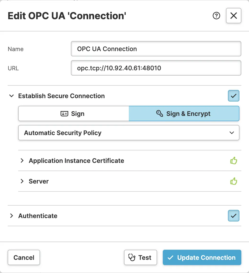 Again, we've put a lot of thought into this, tested many different server configurations, and explored the depths of the protocol. So we're pleased to report that HELIO 25.1.0 now allows you to easily establish signed connections with OPC-UA servers. 💪😎